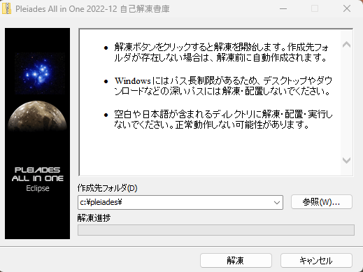 作成先を参照ボタンで指定し、解凍ボタンをクリック