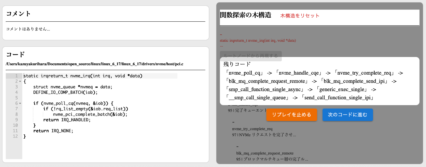 前回の記事で紹介した「Linuxカーネル可視化サイト」ですが、木構造で関数追跡を理解できる反面、いくつかの不満点を自分で見つけました(ちょっと急行列車で急いで作りすぎていたかもしれません...)。