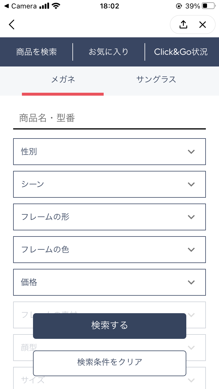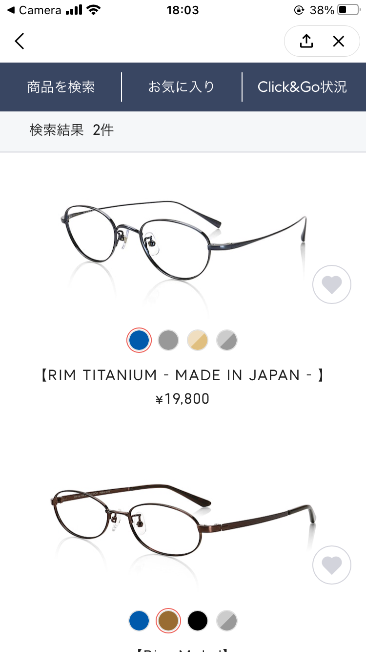 検索結果からメガネを見ていきますが、なかなかClick&GOに対応している商品がありません、、!まだ始まったばかりのサービスということもあるので致し方ないというところでしょうか。