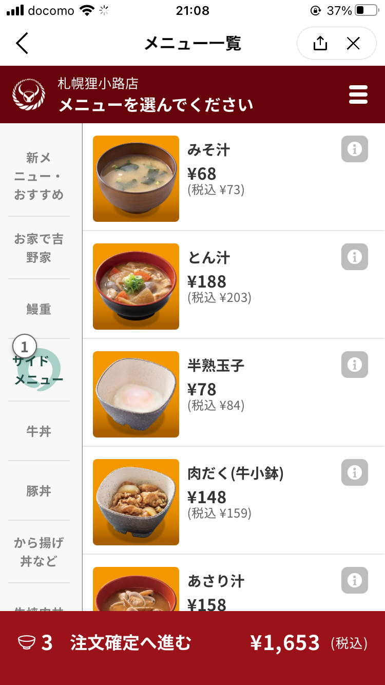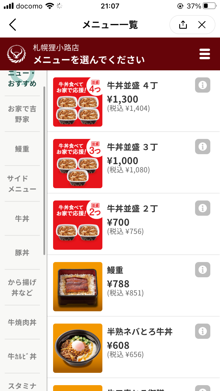 これは見た目も綺麗ですし、実際に触ってみても非常に選択しやすかったです。吉野家は意外とメニューの種類が色々あったりするのですが、迷わず食べたいものを探すことができますね。サムネの写真やカテゴリの分け方・順番など、こちらもよく考えられているように思いました。