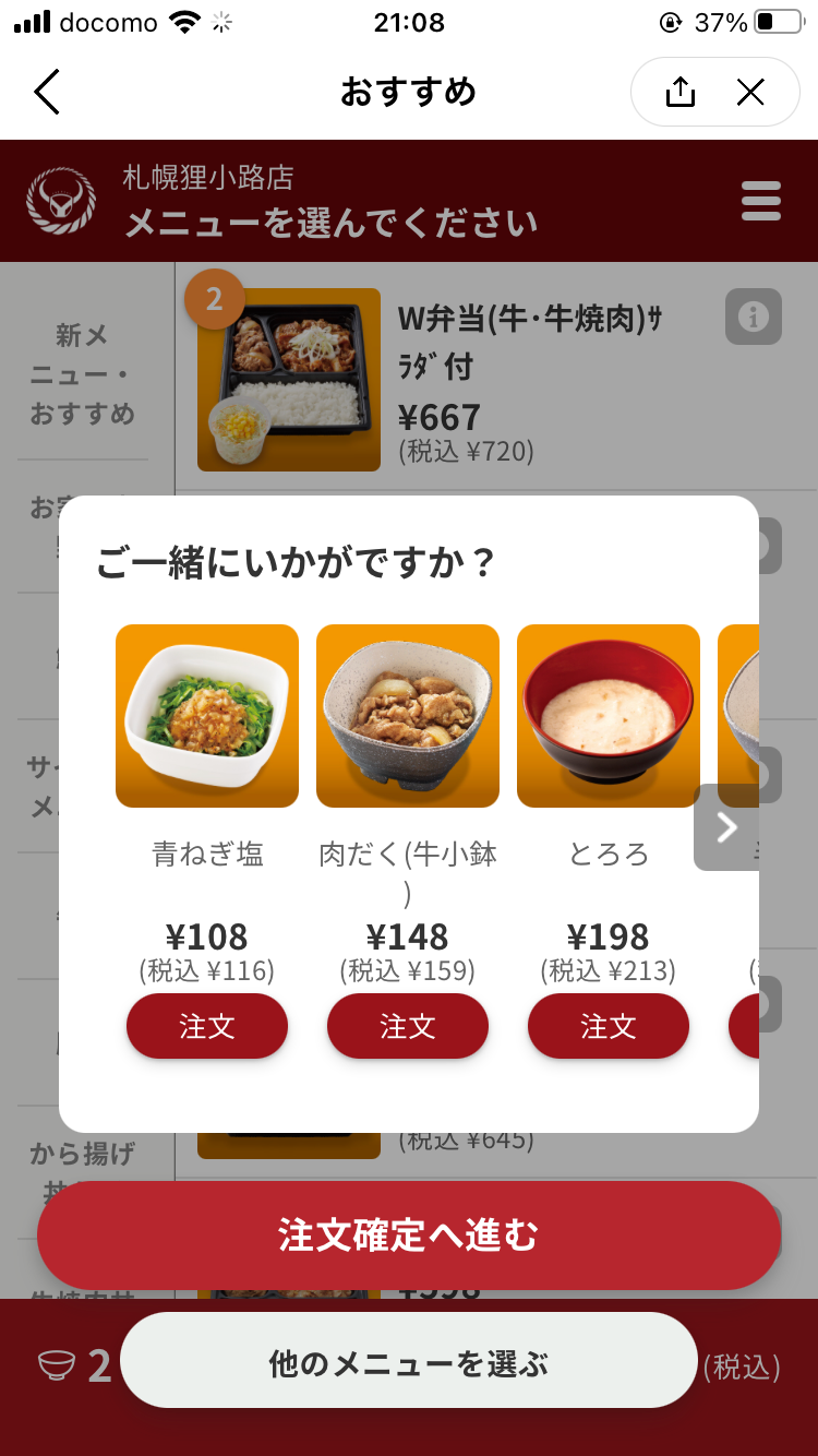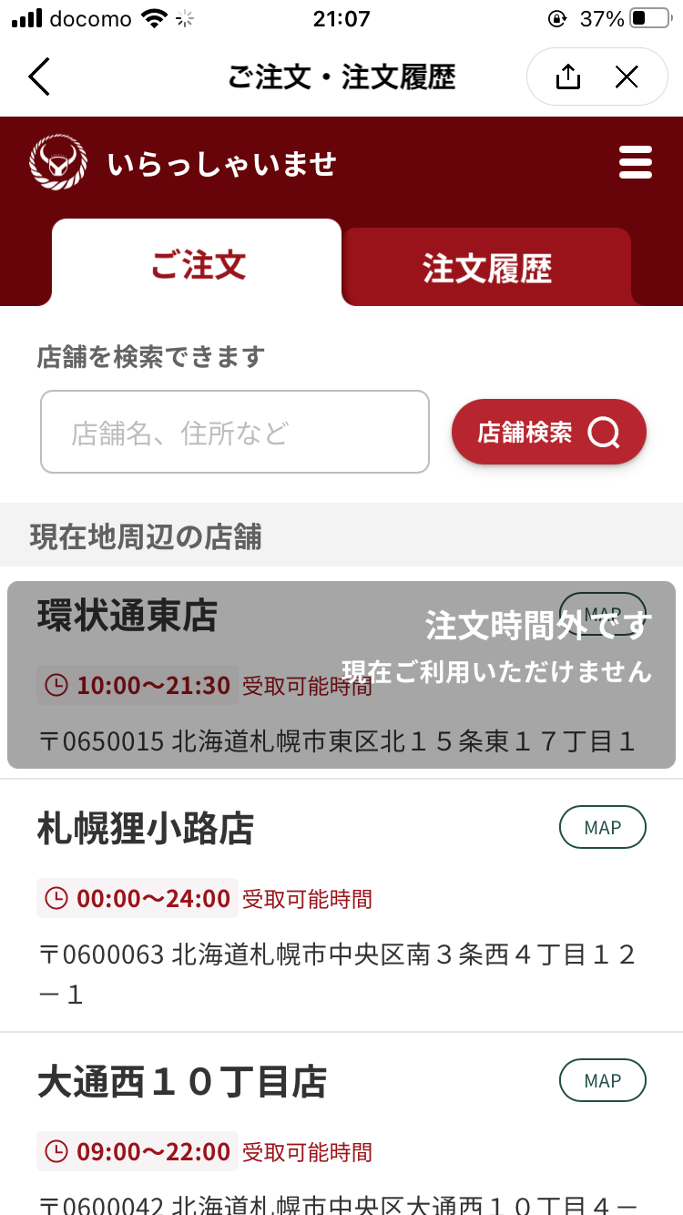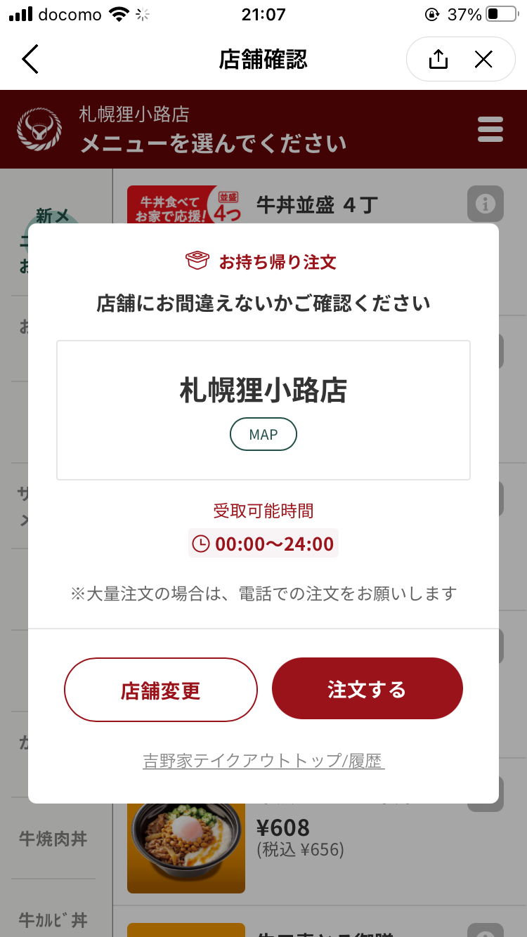 吉野家はお店の数が多いですし、モバイルオーダーで店舗ミスは痛いので、多少煩わしいとしてもウインドウを出して防いでいく。よく考えられたUXですね。