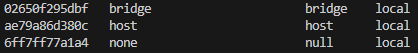 docker network lsでネットワーク一覧を表示すると、bridgeという名前のネットワークがデフォルトで作成されています。上の構成図で2つのコンテナが接続しているブリッジです。