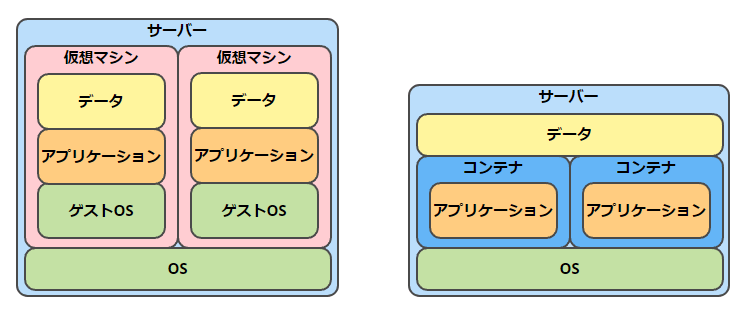 仮想マシンではOSも含めて一つのシステムとして構築する必要がありますが、DockerはOSを共通で利用し、コンテナを切り替えることで容易に内容の異なる環境を構築できます。
