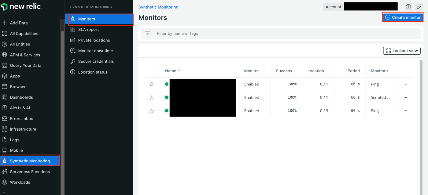 (左のタブに Synthetics Monitoringが表示されていない場合、All Capabilities からSynthetics Monitoringを追加することで表示されます。)