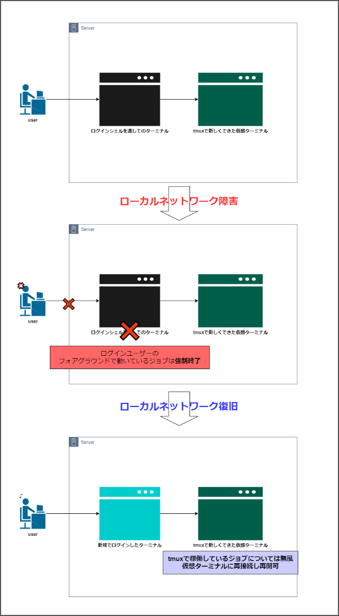 OS上で動いているので、sshしている最中に急に自端末が死んでも 作業先のOSで動き続ける