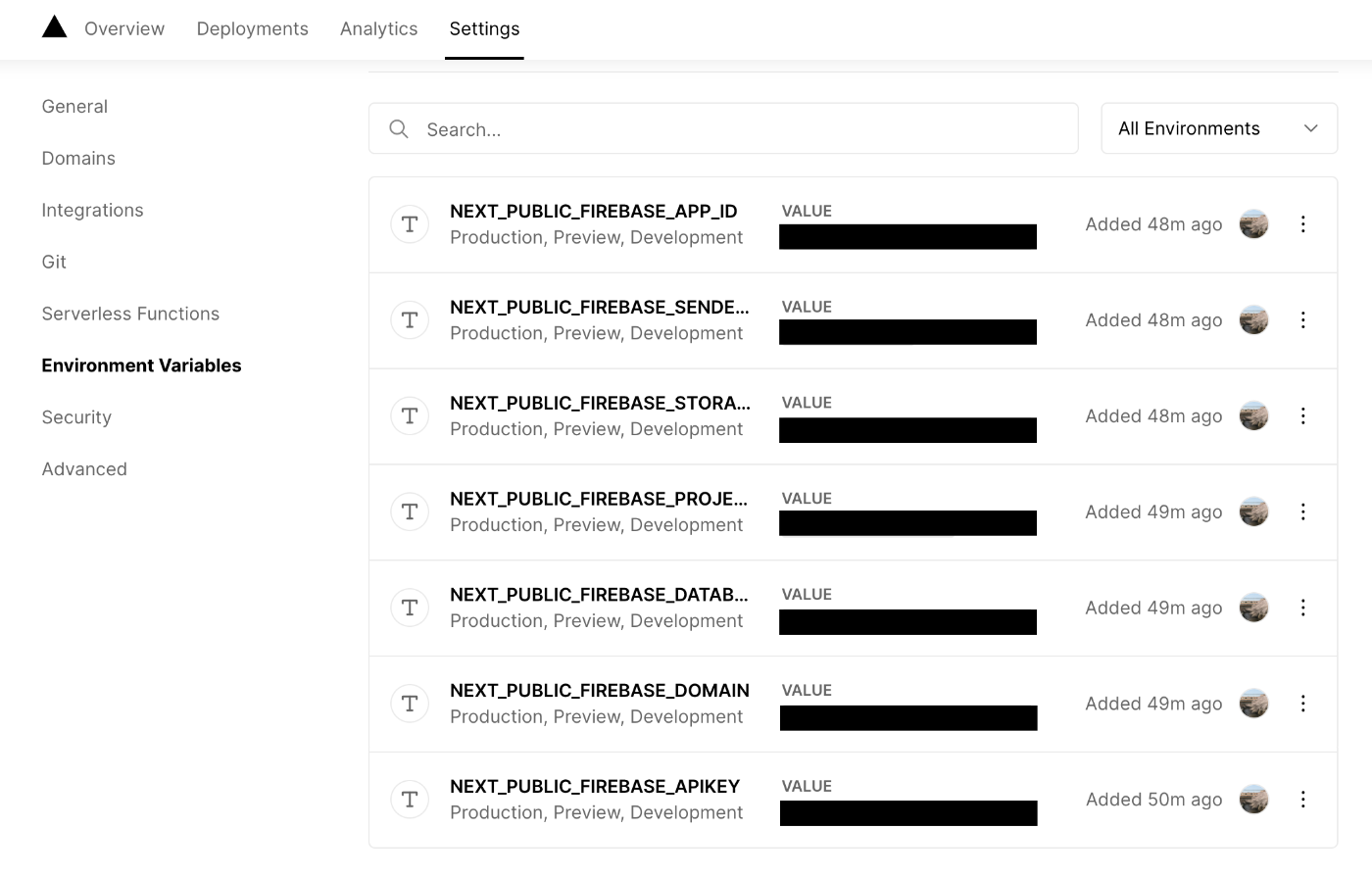 へ行き環境変数を設定する。環境変数はfirebaseコンソールのプロジェクト設定 > 全般にある。privateKeyとclientEmailは秘密鍵のjsonに書いてある。