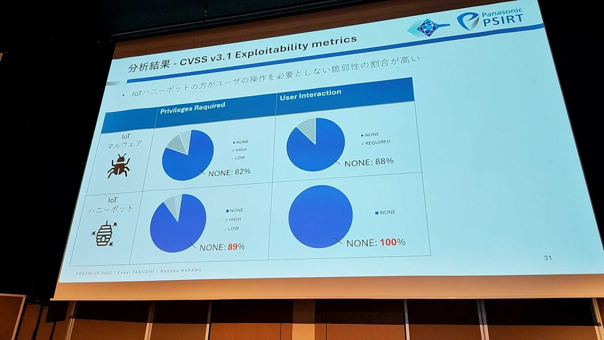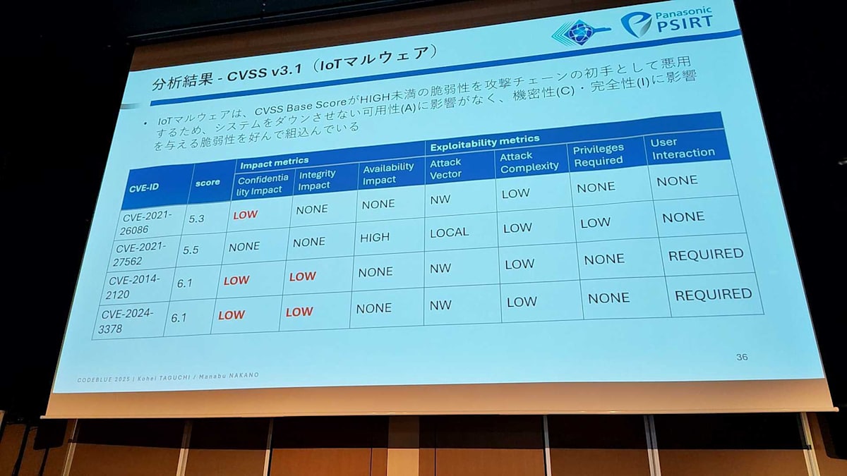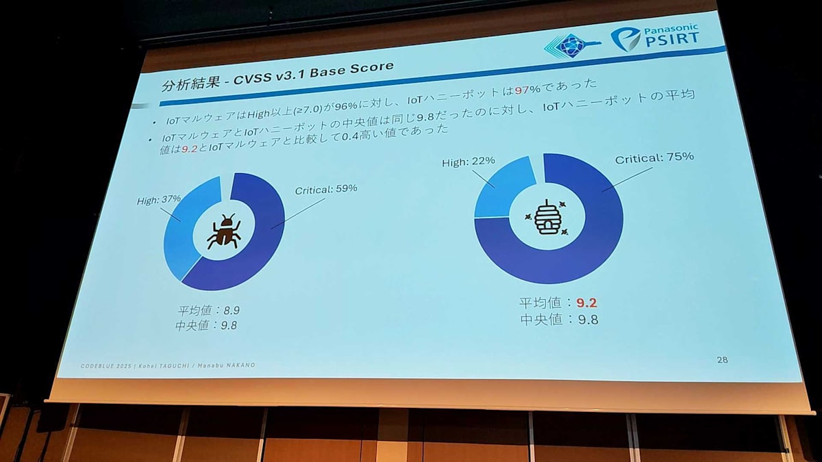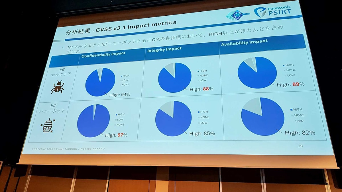 本講演では、パナソニックの IoT 機器をハニーポットとして運用して特定した「実際に悪用されている脆弱性」と、OSINT から収集した「IoT マルウェアが標的とする脆弱性」の CVSS パラメータを比較・分析します。