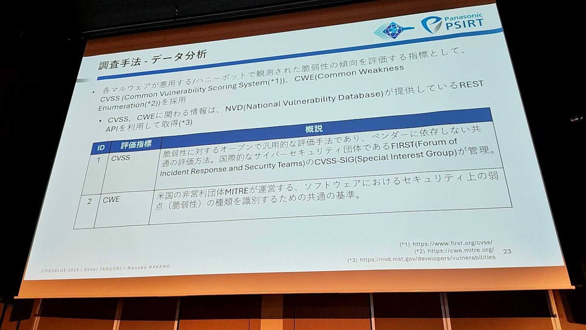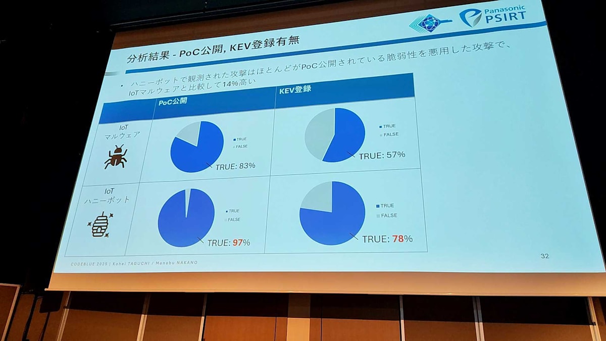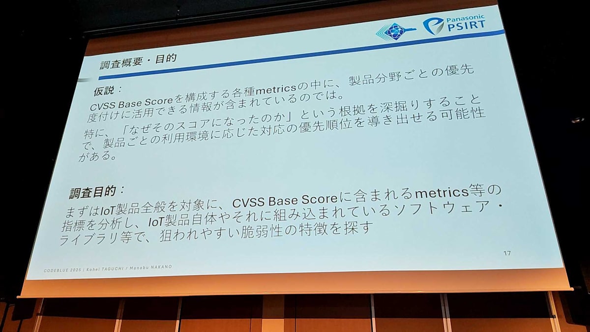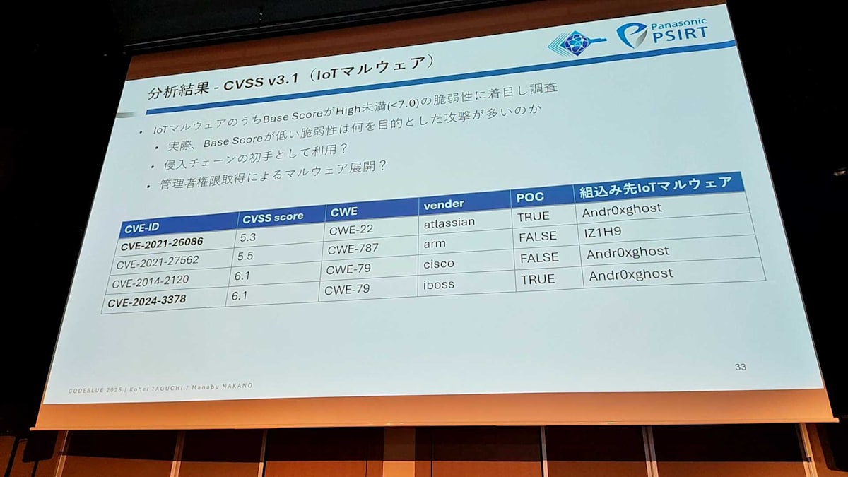 本講演では、パナソニックの IoT 機器をハニーポットとして運用して特定した「実際に悪用されている脆弱性」と、OSINT から収集した「IoT マルウェアが標的とする脆弱性」の CVSS パラメータを比較・分析します。