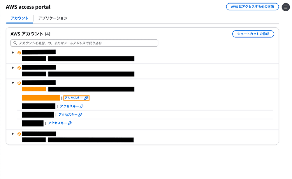 AWS access portal画面 - 「ロール名」の横の「アクセスキー」をクリックします。