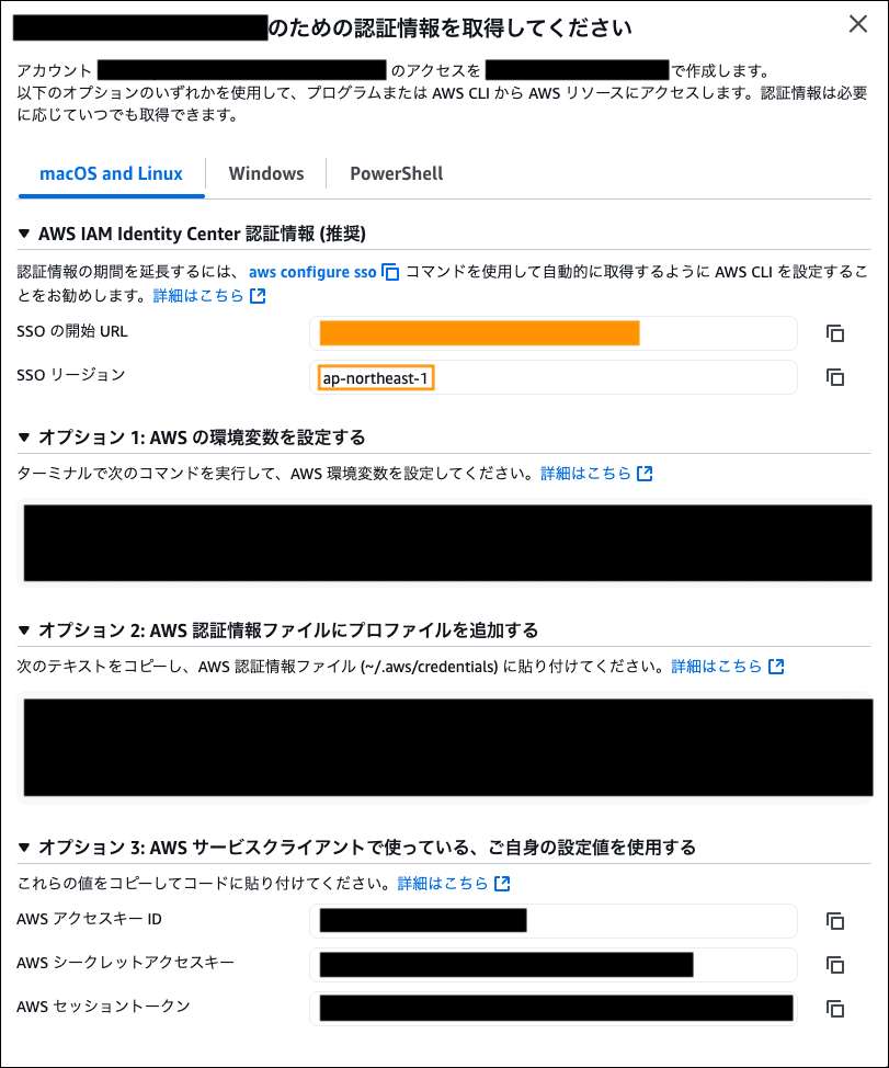 - 表示されたモーダルの内容から、「SSOの開始URL」と「SSOリージョン」をメモします。
