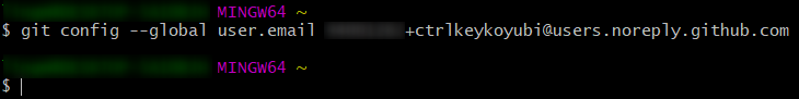 - GitHubのページでアイコン→Settings→Emails→Keep my email addresses privateの説明欄にある、GitHubから払い出されたメールアドレスをコピーする。(