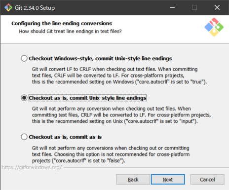 Checkout Windows-style,commit Unix-style line endings. - チェックアウト時はそのまま、コミットするときはLFにする。