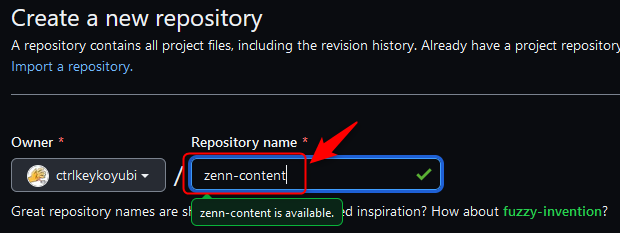 リポジトリの名前をつける。日本語も入力できちゃうけど、実際は英数でしか作られないっぽいので英数で入力する。短くして、スペースは使わずにハイフンでつなぐのがいい感じ。