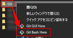 最初に作ったローカルのGitフォルダを右クリックし、「Git Bash Here」をクリックする。