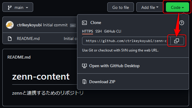 GitHub上で作ったリポジトリのページを開きます。そこの「Code」をクリックし、表示された「HTTPS SSH GitHub CLI」のコピーボタンをクリックします。クリップボードにURLがコピーされます。