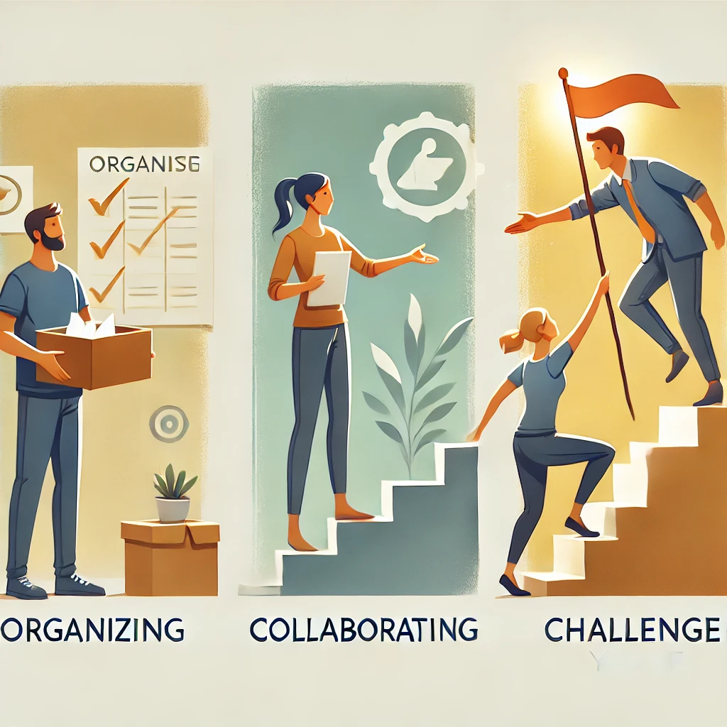 GPT: 3つの行動(整理、協力、チャレンジ)を象徴するアイテムを持った3人の人物が、それぞれの役割を果たしている