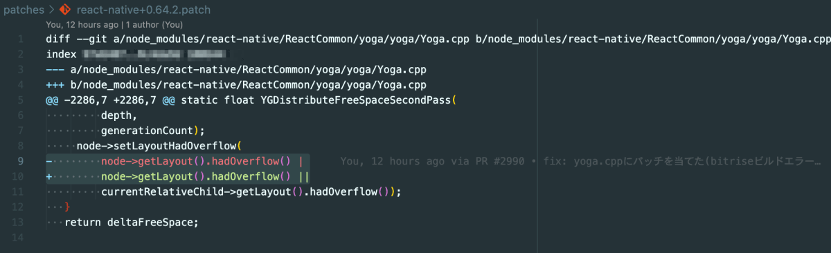 すると、ディレクトリに patches/react-native+0.64.2.patch みたいな名前のパッチファイルが作成されます。