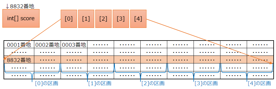 配列変数の宣言によりint[]変数が、new演算子により配列の実態(要素の集まり)がメモリ上の区画に作成されます。