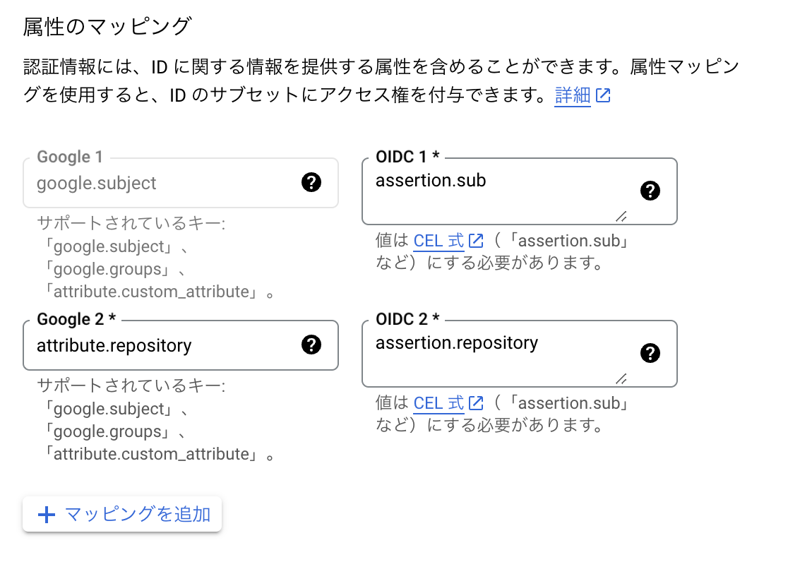 は Workload Identity 連携で作成したプールとプロバイダの ID になります.詳しくは後述します.