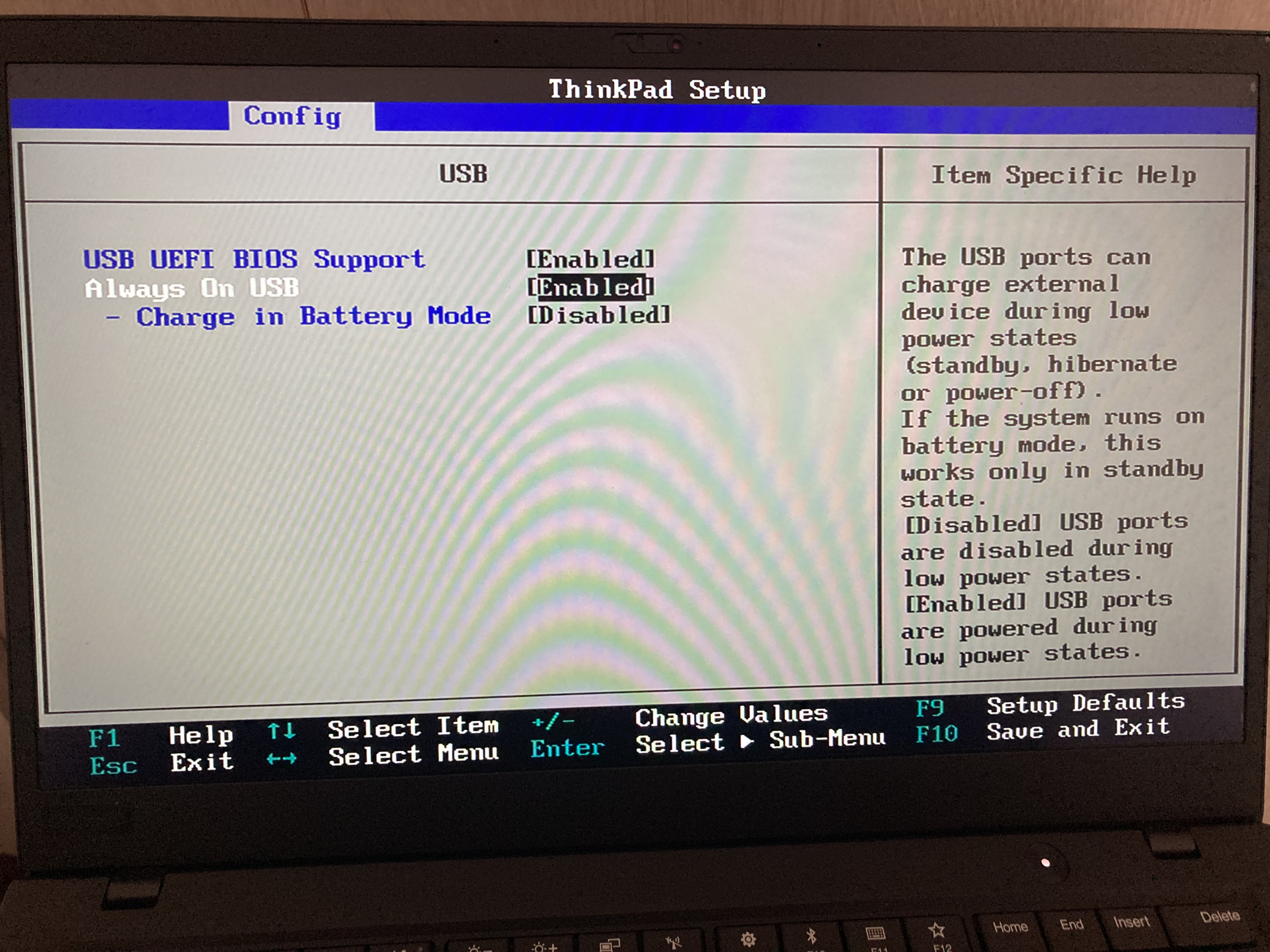 ThinkPad BIOSからパワーオフ時のUSB給電を無効化する (Always On USB)