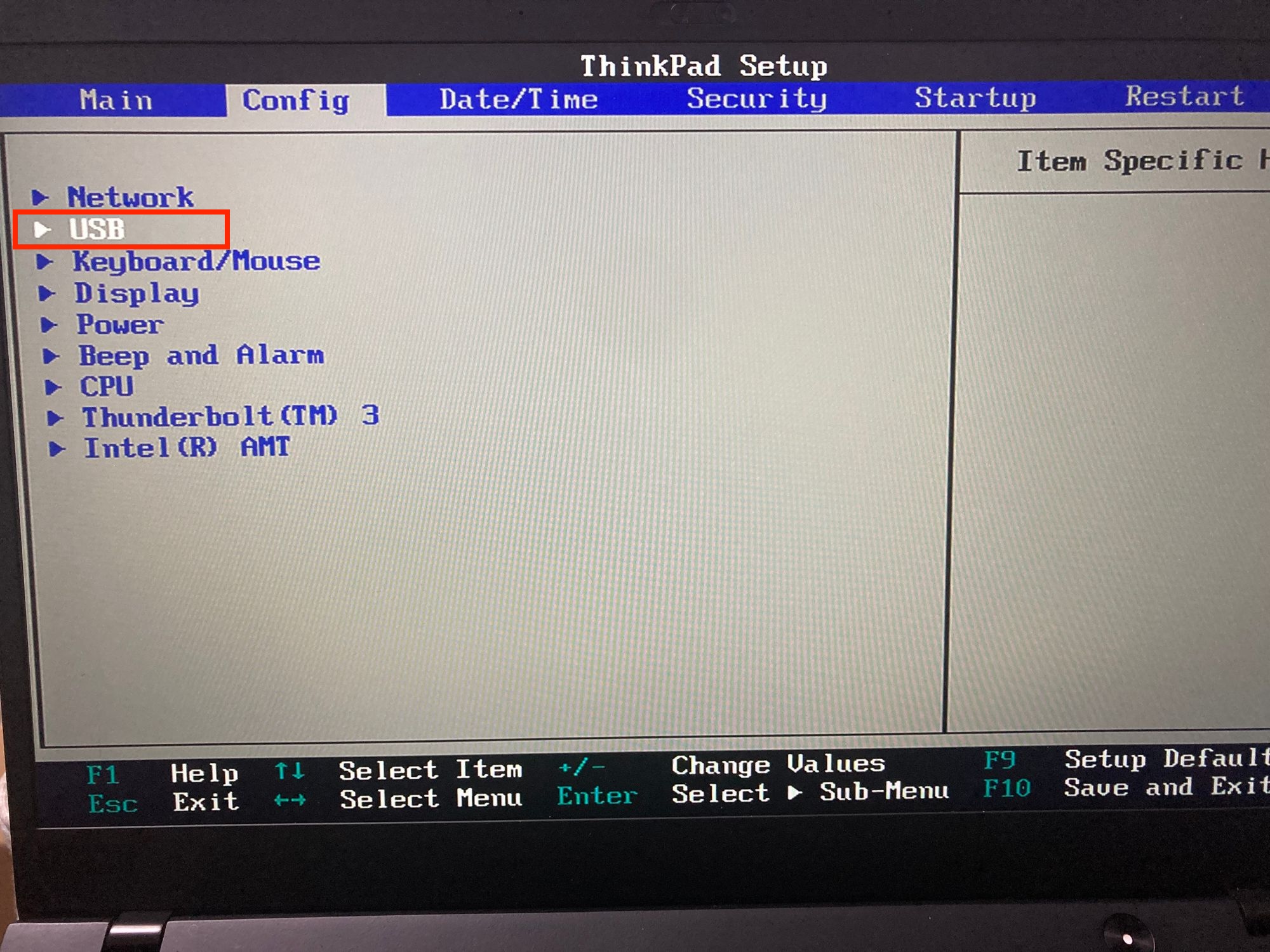 Mainメニューから 「Config」タブに移動し、「USB 」の項目を選択します。