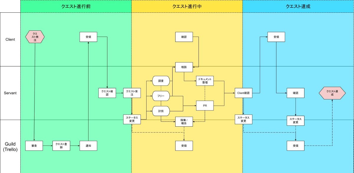カイゼンしたい意見や要望をClientがGoogleFormから記入し、Guildが入力内容をチェック、OKのものはクエストボード(Trello)にGASによる自動取り込みがされ、貼られているクエストをServantが受託しこなし、それを評価していく。