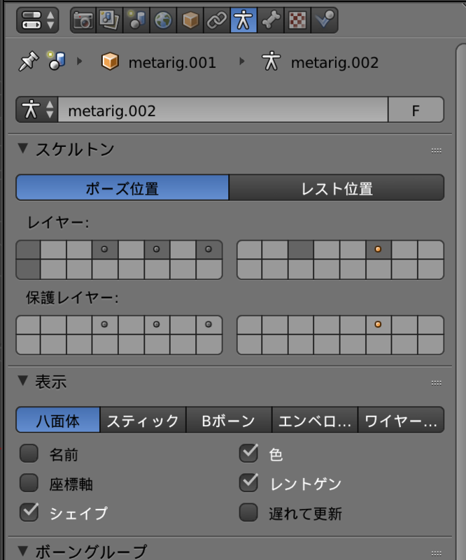 あてはめる時にボーンがみえなくなってしまうのでボーンを選択してレントゲンにチェックする。