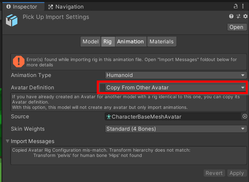 ・AvaterDefinitionをCopyFrom~に変えて適当にアバターをあてはめると解決らしいがやってみたらエラーがでる。下の画像でもともと設定されている名前のボーンとあてはめたいモデルのボーンが異なるので適用無理と言われてる。ほかのアバターでもエラーが出たのでこの解決方法はようわからん。