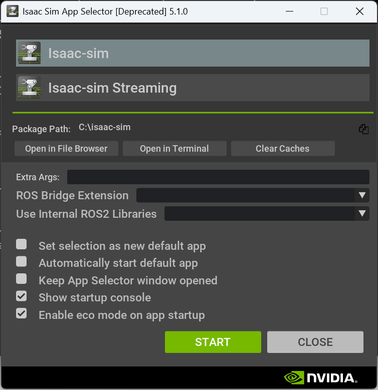 C:\isaac-simフォルダ内にあるisaac-sim.selector.batをダブルクリックします。 -
