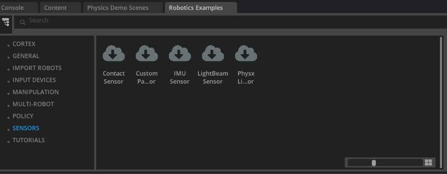 ここで紹介したチュートリアル以外にもサンプルがたくさんあり、例えばメニューバーの[Window] > [Examples] > [Robotics Examples]からロボティクス関連のサンプルを実行することもできます。
