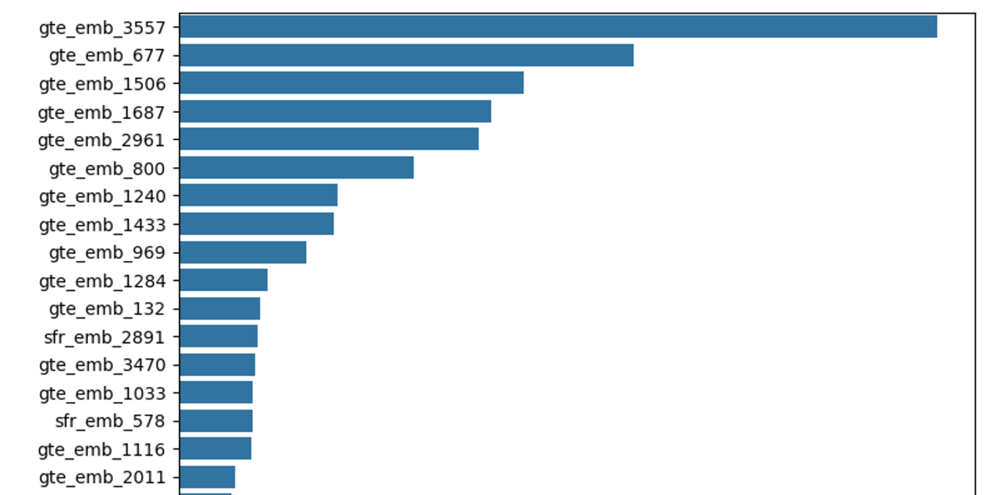 上記で作成した全ての特徴量を用いて、LightGBMとXGBoostで学習を行いましたが、どちらのモデルでも精度にほとんど差はありませんでした。以下はLightGBMにおける特徴量重要度の結果ですが、ベクトル化による特徴量が上位を占めているという状況でした。