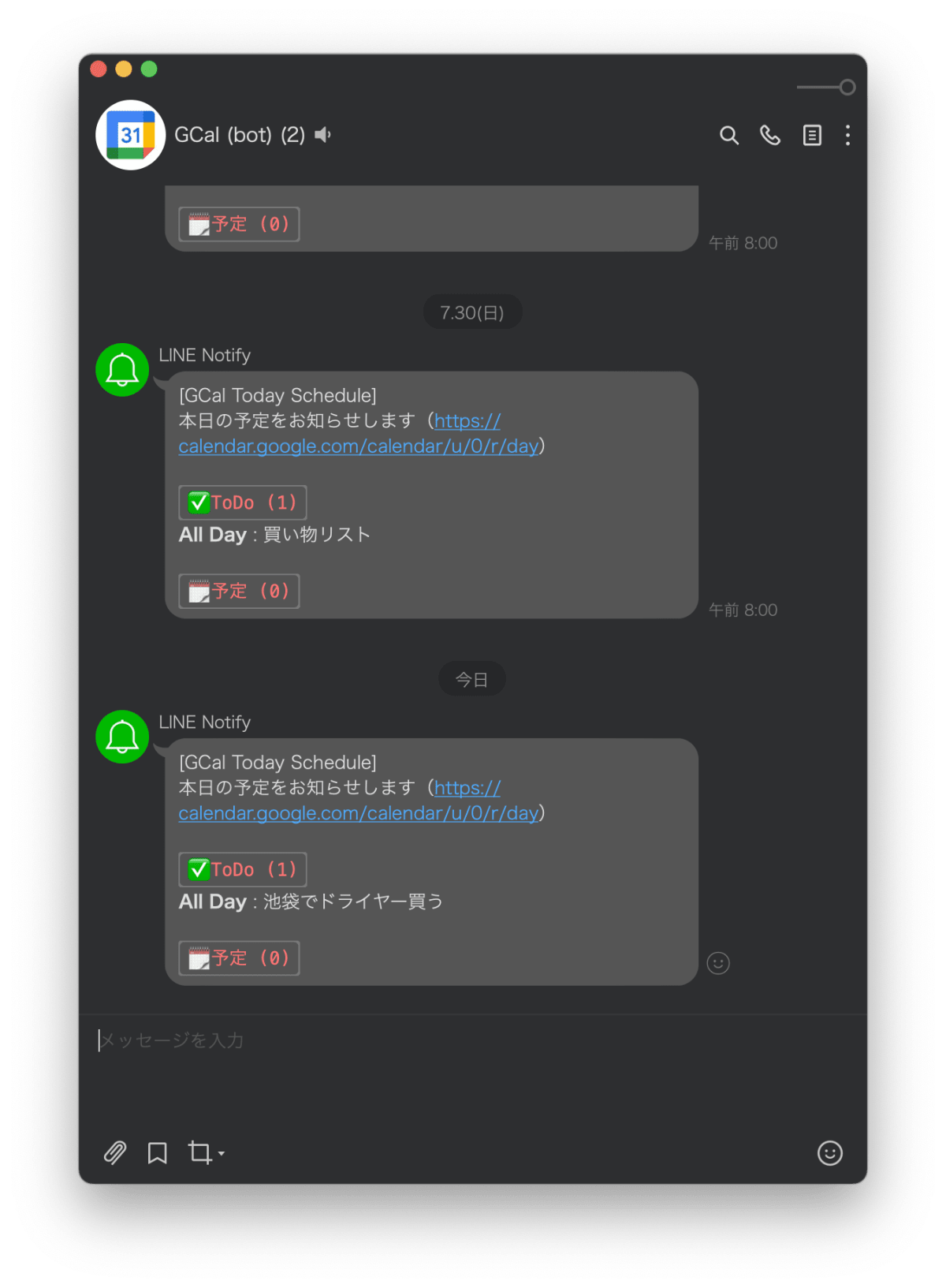 なので、毎朝 LINE に予定を通知してくれるようなものがあれば便利だなと思い、作ってみました!