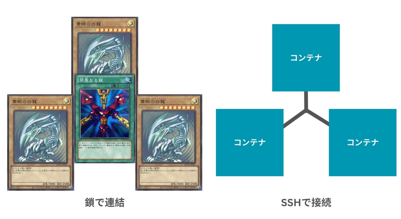 Swarmのクラスタ管理の実体とは連結させて手続き上一つに見せるもので「ブルーアイズ三体連結」のようなもので、コンテナとは「ブルーアイズ」、SSHとは「鎖」でした。