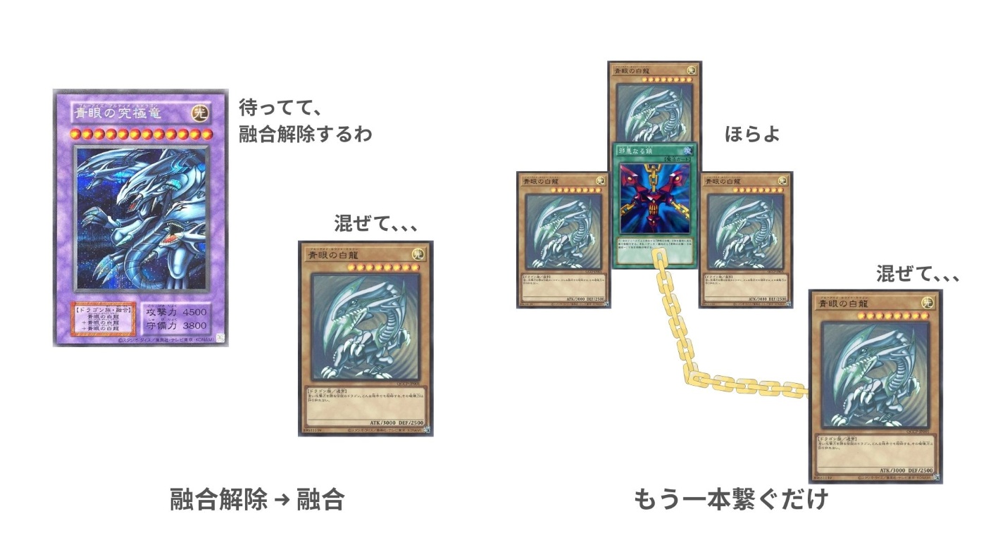 仮に遊戯王でブルーアイズの四体融合ができるとして、一度でも三体融合でアルティメットにしてしまうと、四体目を融合するのは大変です。