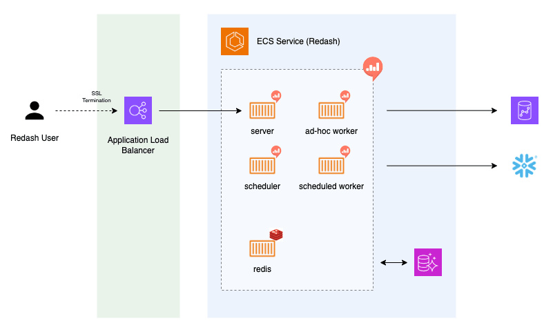 といっても特段変わったものはなく、プライベートサブネット上に Redash が稼働する ECS サービス、およびアプリケーション用 DB として Aurora PostgreSQL を構築しています。ユーザーが Redash にアクセスする際はパブリックサブネット上に配置した ALB を経由させています。