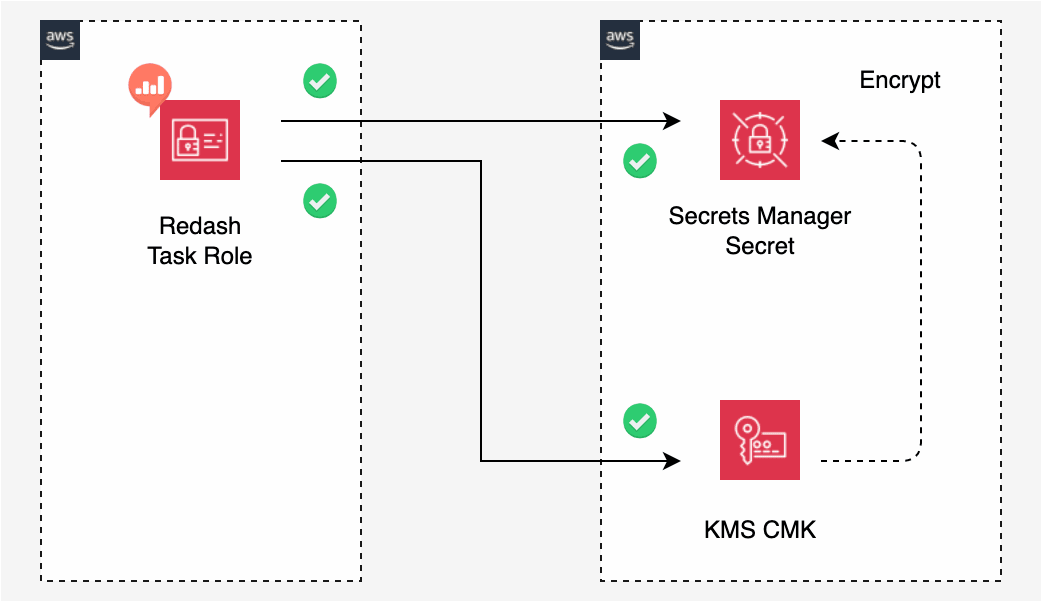 シークレットをクロスアカウントで読み取るには、KMS CMK を作成し、これをシークレットの暗号化キーに使用します。Redash Task Role に対して、シークレットの読み取り権限だけでなく、CMK に対する kms:Decrypt