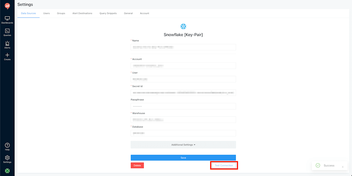Redash 用 URL にアクセスして今回追加した Key-Pair 認証対応の Snowflake コネクタで接続を作成し、[Test Connection]