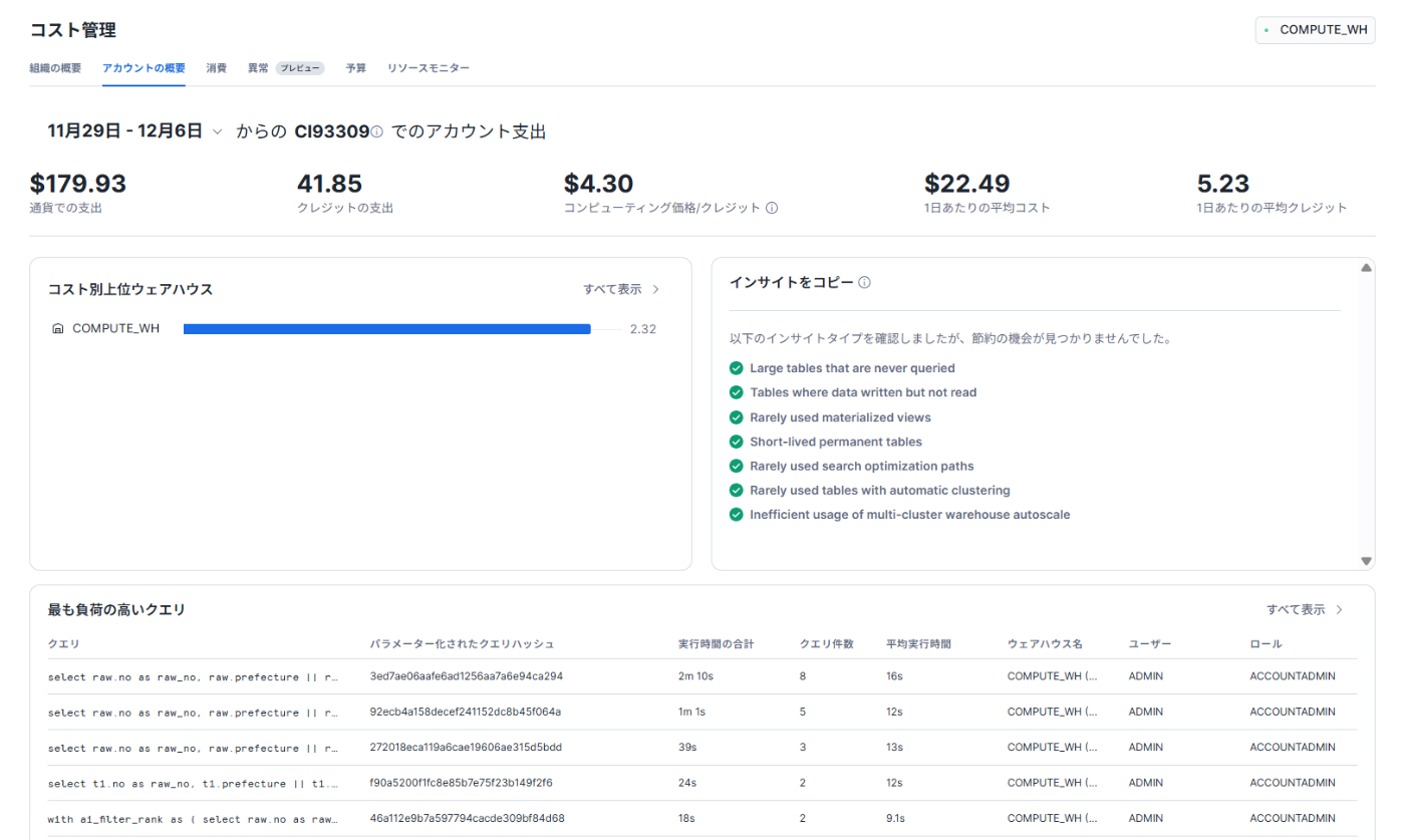 ウェアハウスサイズXSで、100件×100件をAISQLでjoinする実行時間10数秒のクエリです。30回くらい叩いたくらいで、42クレジットも消費するのか??