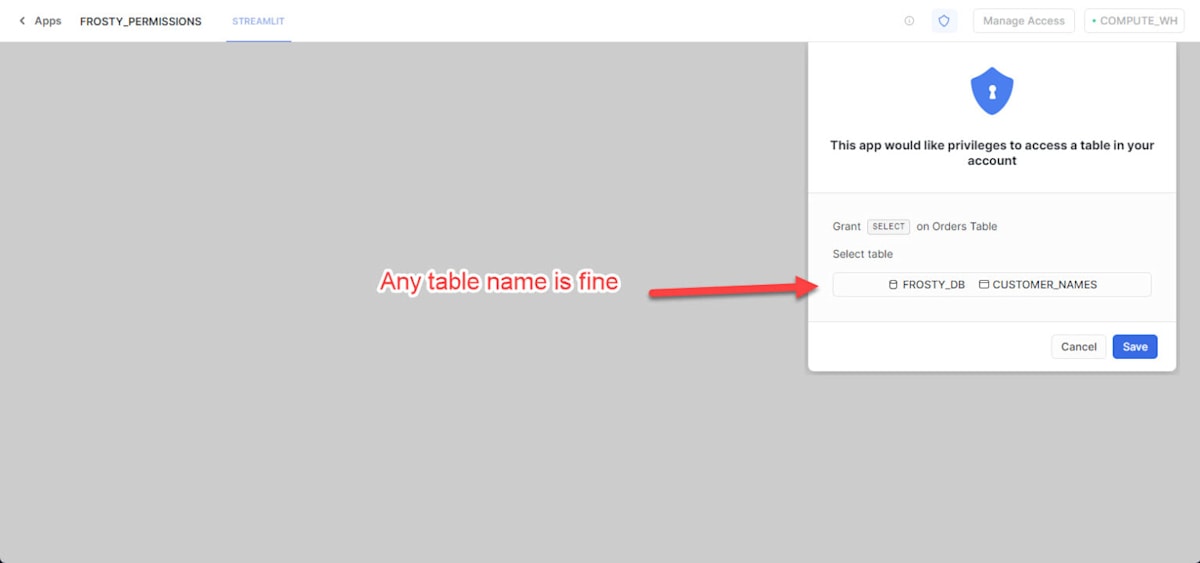 Streamlit アプリ内で request_reference("frosty_table") を呼び出すと、このセクションの frosty_table を読み込み、記載内容に従って権限を付与します。