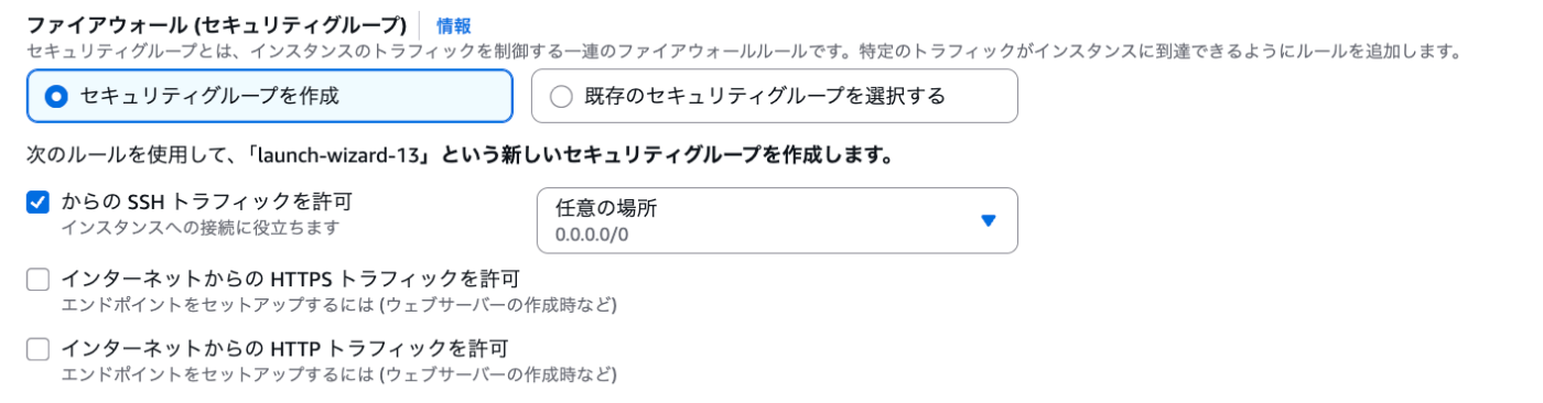 ファイアウォール (セキュリティグループ) | 既存のセキュリティグループを選択する | 事前に準備したセキュリティグループを利用するので、こちらを選択します。 |