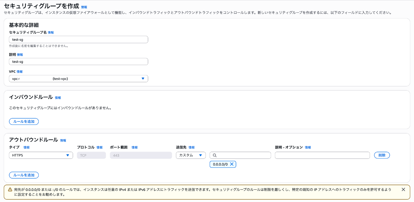 アウトバウンドルール 送信先 | カスタム 0.0.0.0/0 | 「EC2から」送信される通信を全て許可します。ただし、この設定は最小権限の原則を守ってはいないです。厳密には宛先であるSSMのIPアドレス範囲に制限すべきですが、今回はSandbox環境であり企業ポリシーとして認められているという前提で進めます。仮に認められていない場合は、VPCエンドポイント利用を検討した方が良いです。SSMのIPアドレス範囲は完全に固定されているわけではないので、都度運用が必要となるからです。VPCエンドポイントを利用すると有料ではありますが、IPアドレス変更があったとしても都度運用は必要ありません。 |