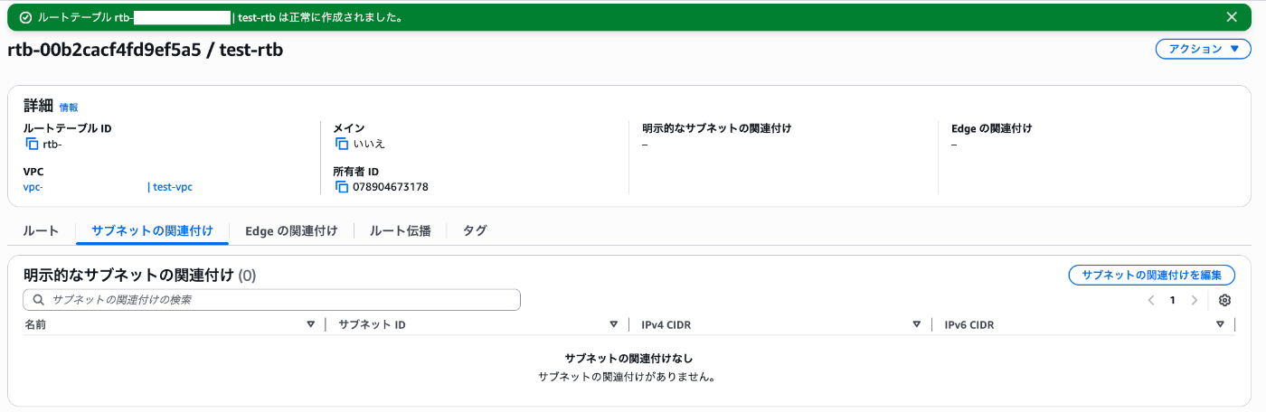 タグ | Name: test-subnet | 名前タグに入力した文字列がそのまま「Name」タグとして入力されています。特に修正する必要はありません。 |