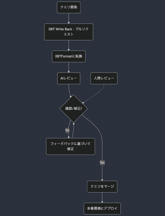 私たちは、以下のフローを実現するために、データオーナー(エンジニアも非エンジニアも)が自分でad-hocクエリを作成できるようにしています。これには、dbtのwrite-back機能とGithub Actionsを使っています: