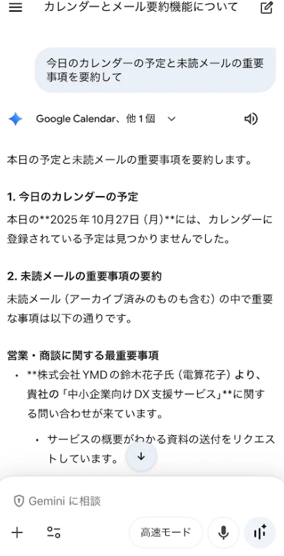 朝起きたら、Geminiが重要なメールをピックアップして要約してくれています。会社に行く前にやるべきことを把握できるので、出社後の動き出しがスムーズになります。- 「毎週月曜の朝8時に今週の予定を教えて」