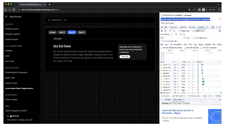 Vercel公式のページだとVercelのキャッシュ等の関係で正確な結果になりそうにないなと判断したので、不採用としました。Chromeのデベロッパーツール(Networkタブ > Timingセクション)を利用します。