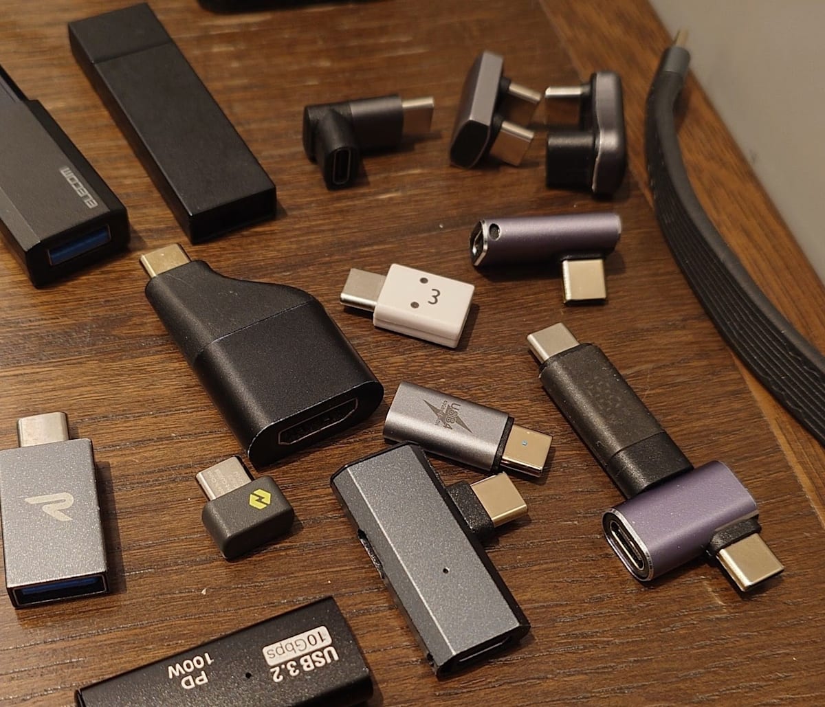 あとは、Type-C↔HDMI変換のためのアダプターやTypc-CtoAアダプター、SteamDeckのケース、専用バッグなど、色々あるのですが、全部紹介すると、キリがないので、割愛します。(テーブルにぶちまけた画像だけ)