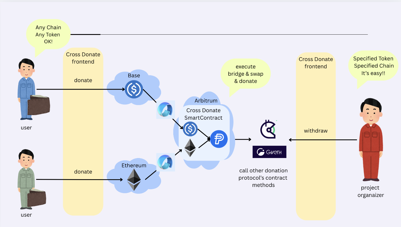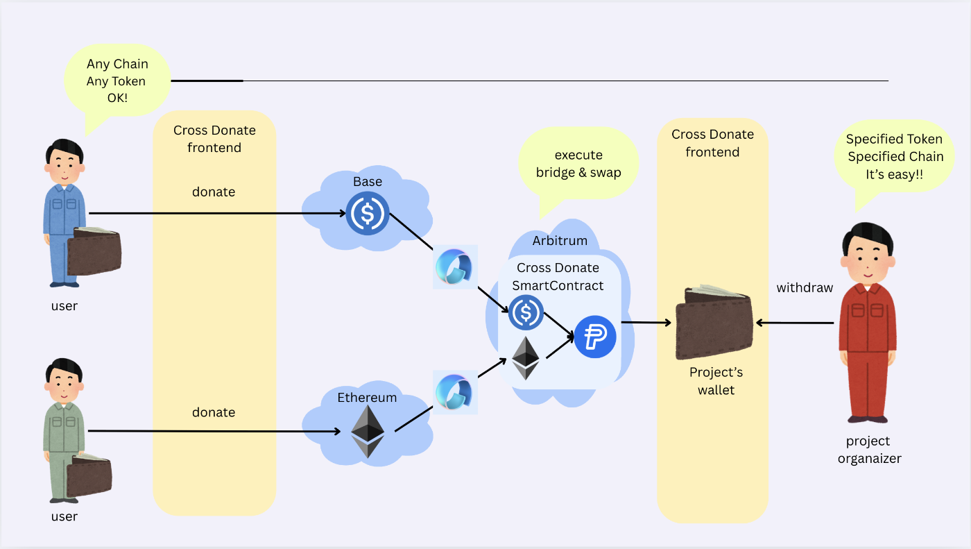 寄付者もプロジェクト側も、チェーンやトークンの違いを意識せずに寄付のやり取りができるようになることを目指しています。
