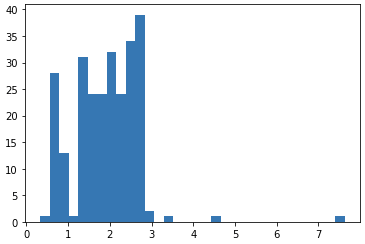 以下は入力画像に対して適応的に計算されたビンのヒストグラム。今回の画像では1〜3メートルあたりで細かく深度が分割されていることがわかる。