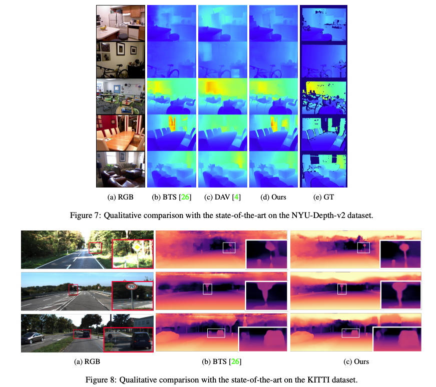 屋内(NYU Depth v2, SUN RGB-D)、屋外(KITTI)の両方のデータセットで検証を行った。既存手法より改善。詳細は省略。