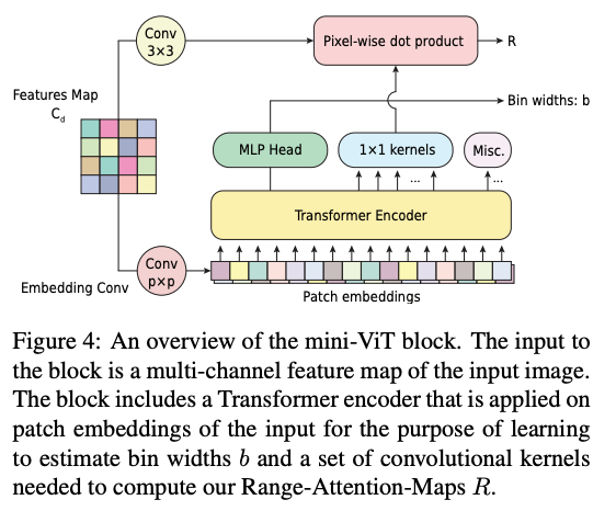 AdaBinsモジュールは小サイズのVision Transformer(mini-ViT, mViT)を含んでいる。mViTは抽出された特徴量から各ビン幅を表すベクトル